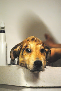 Another family nearly took him, but they decided he stank. He did! He and his siblings had obviously rolled in some pee, but hey--that washes off! Jenny got right down to it and washed that puppy till he shone!