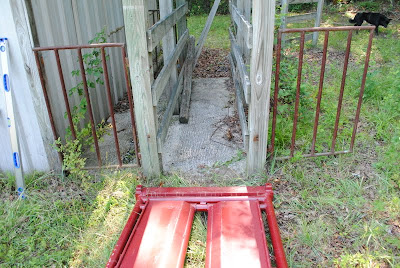 Of course, even with a head start (pun intended), nothing is ever as easy as you think it's going to be. The chute was built for a narrower head gate than the one we bought from Tractor Supply. So Herb had to bolt a 4x4 post to the existing right-hand post.